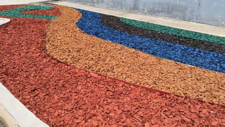 这些彩色有机覆盖物主要利用树木粉碎车将树枝粉碎,以树枝粉碎物、树皮等园林废弃物为原料,通过粉碎发酵、染色加工、添加微量元素等方式进行分级处理后铺设于裸露土壤表面,并以各种不同的颜色搭配。既生态环保,为树木增加养料,又可营造良好的景观效果。通过应用有机覆盖物,既解决了园林废弃物的出路问题,推动了园林废弃物生态应用进程,又为城市的环境美化添加别样色彩。