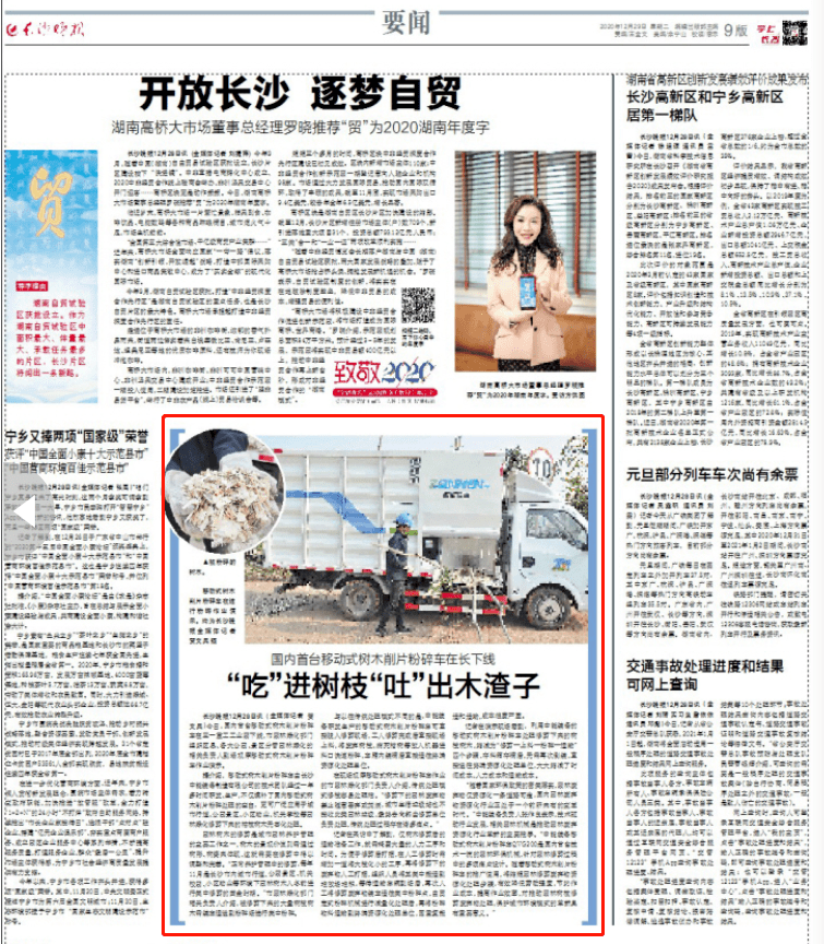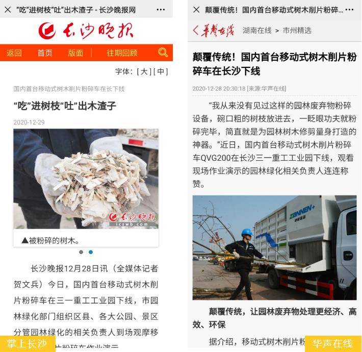 湖南经视-《经视新闻》:只需两个步骤,轻松处理园林修剪后的枯枝败叶。国内首台移动式树木削片粉碎车在省会长沙下线,现场只需要人工塞料,机器自动完成粉碎作业,大大节省了园林废弃物的运输时间和成本。