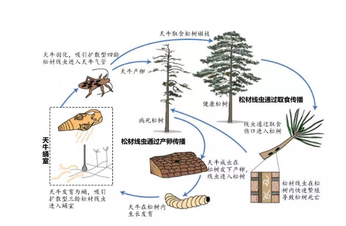 松材线虫病又称为松枯萎病,是一种毁灭性虫害,此病是通过松墨天牛等媒介昆虫传播于松树体内,从而引发松树病害。松材线虫病是国际公认的最具危险性和毁灭性的松树疫病,属于国家重大生态灾害。自1982年我国南京首次发现松材线虫病以来,30多年里全国损失的松树已累计达十亿株,造成的直接经济损失破千亿元,该虫病对国家生态安全、森林资源安全造成了严重威胁。据国家林业和草原局最新数据统计:2020年全国松材线虫病疫情发生面积为180.92万hm²,病死松树数量为1947.03万株。
